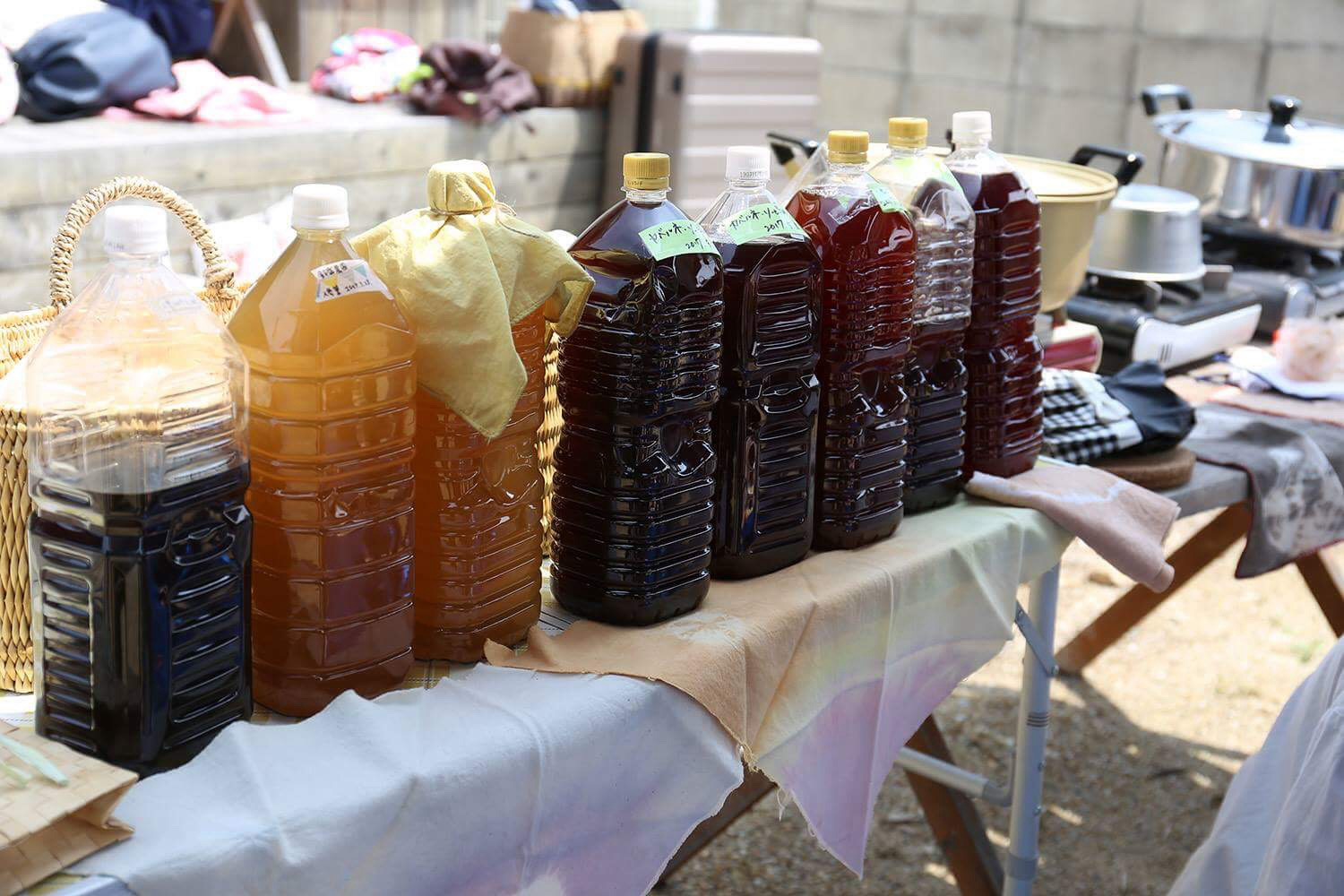 その色を見比べてみていただきたいなと思って、それぞれペットボトルに詰めて並べてみました。
