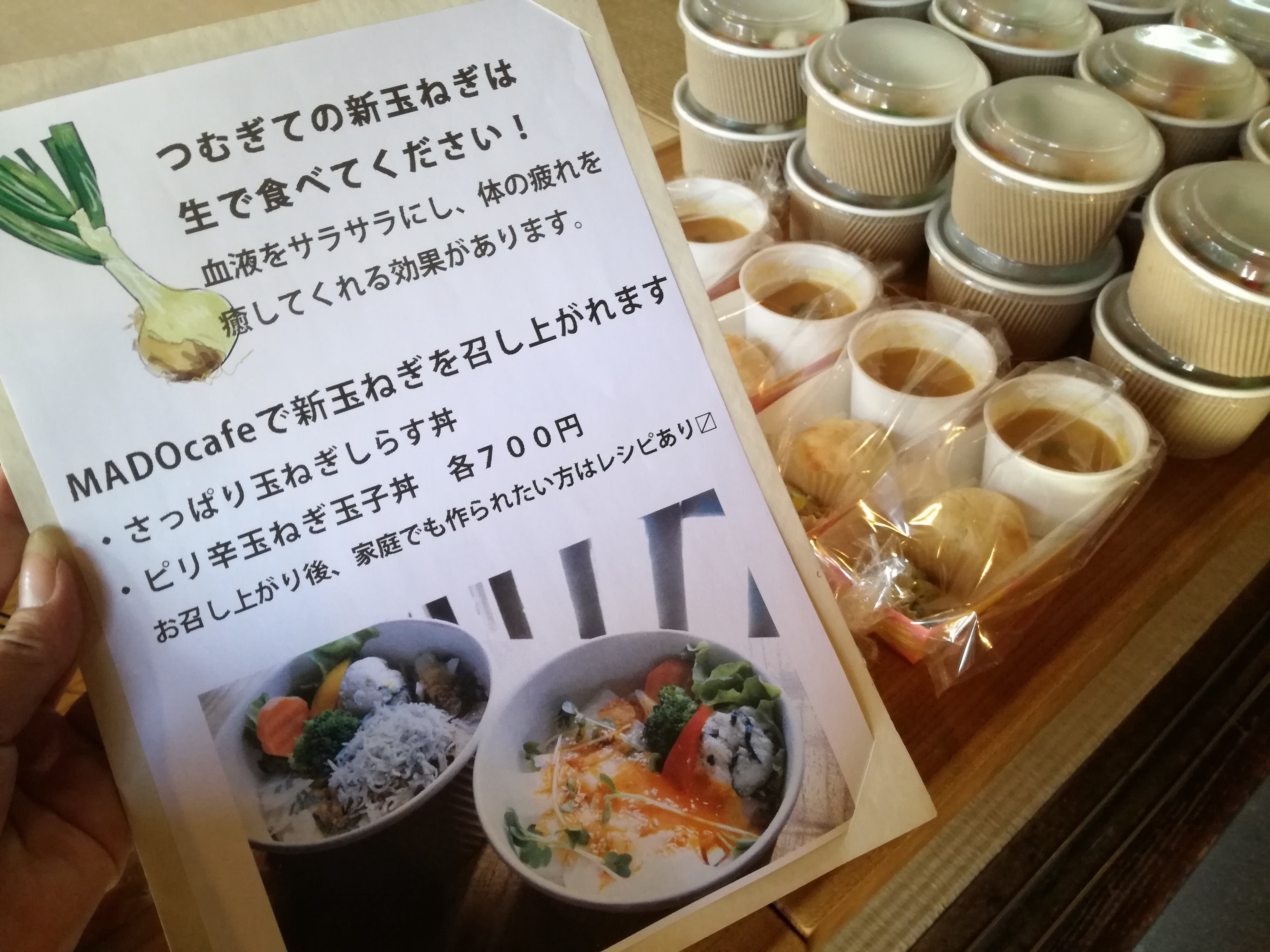 ゲストハウスMADOさんが、ランチメニューにつむぎて新玉ねぎを加えてくださいました!こんなに嬉しいPOPや、レシピまで!