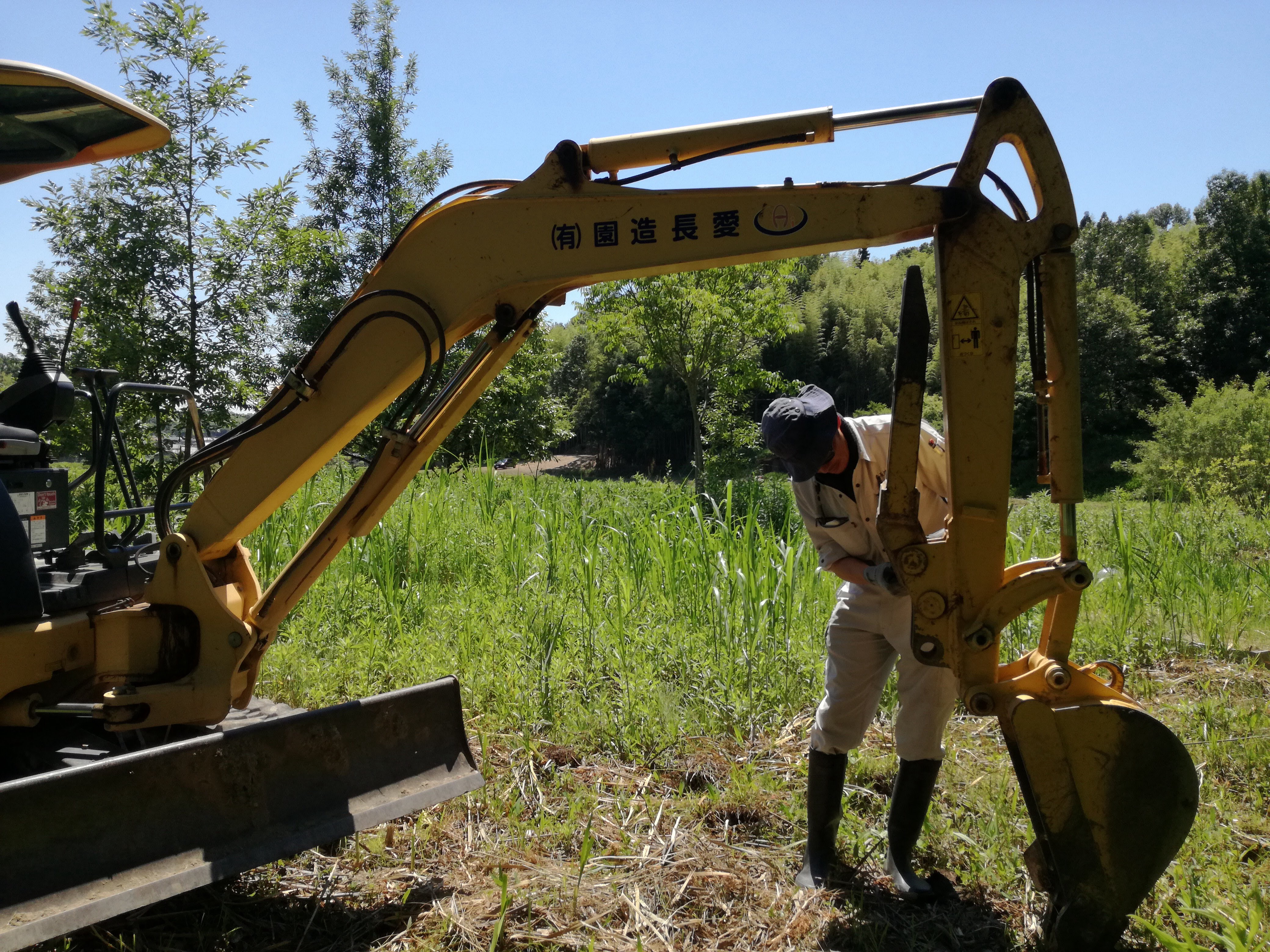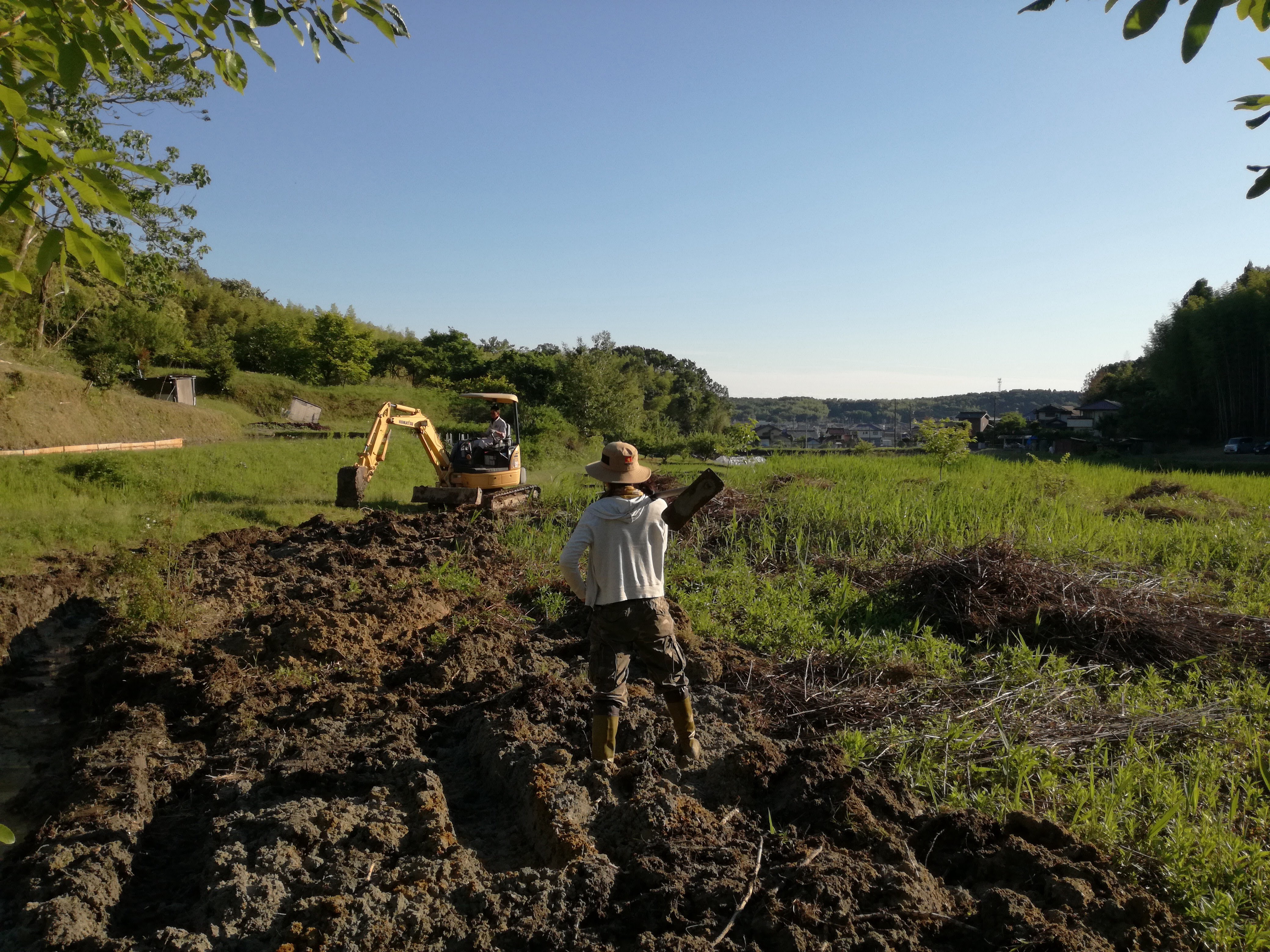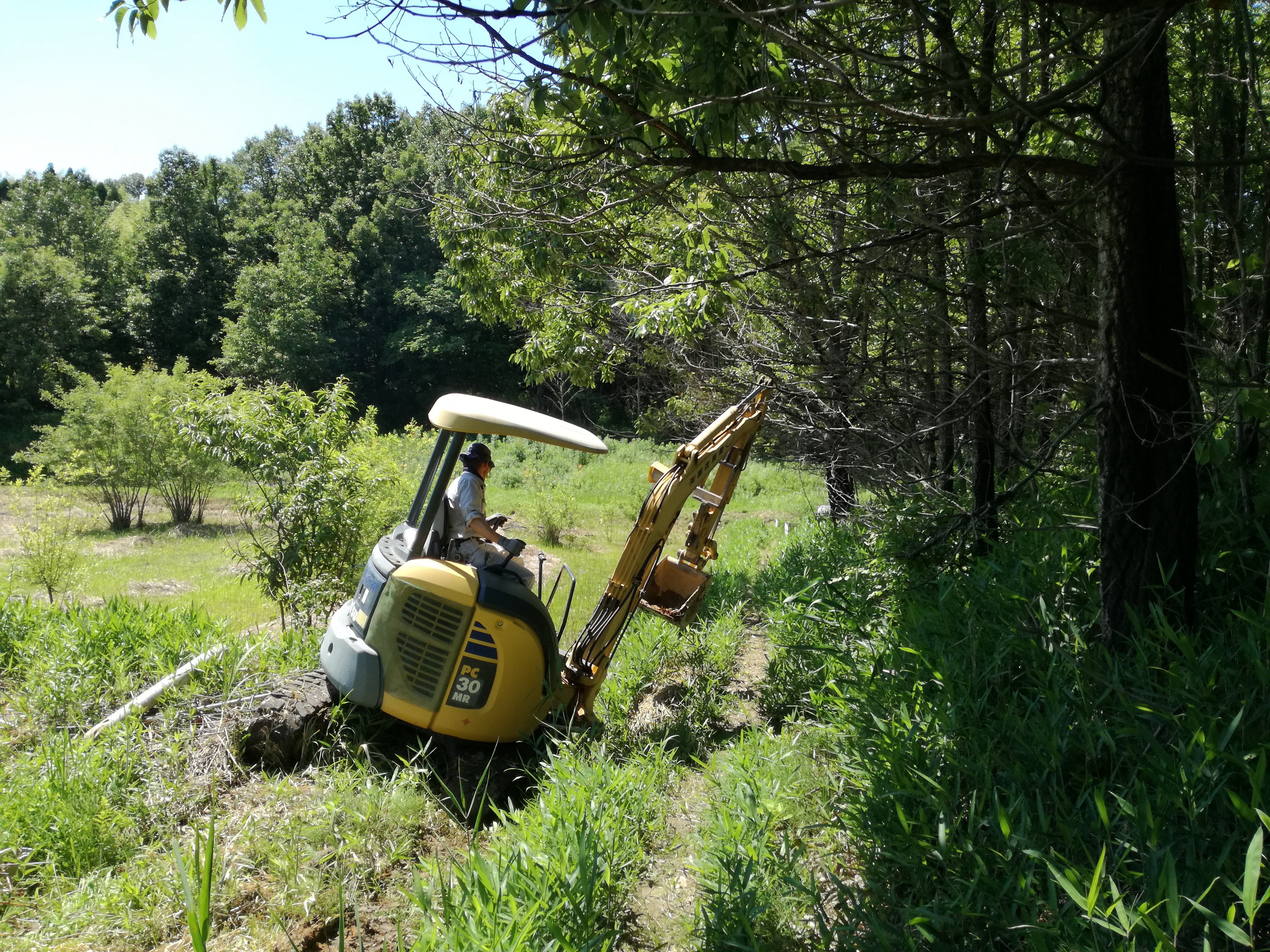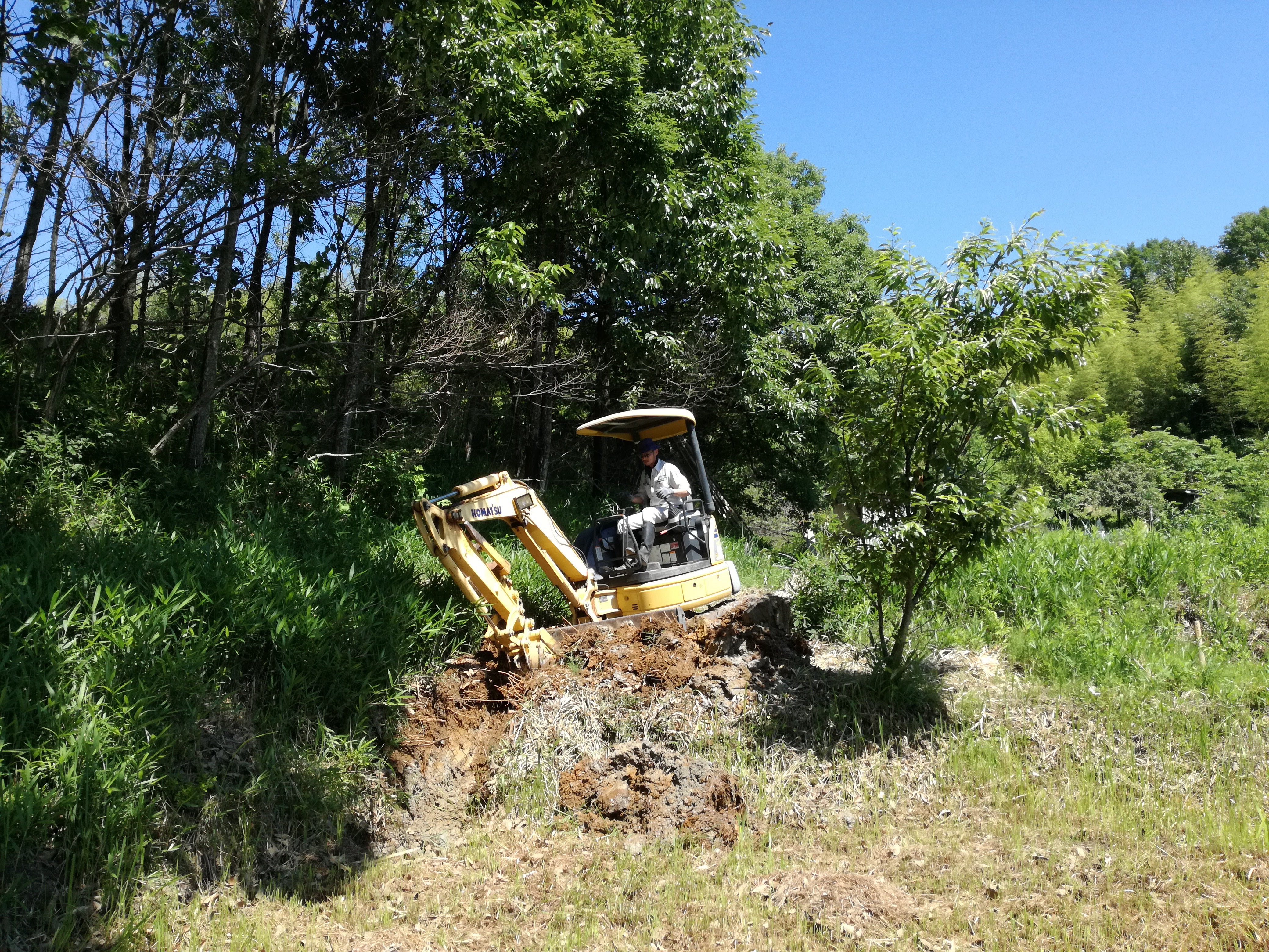 耕そうと試みる度に、鍬が折れ、耕運機が弾かれてたところなので、重機のパワーに圧倒!! 感動して、ずっと重機につきまとい(笑)