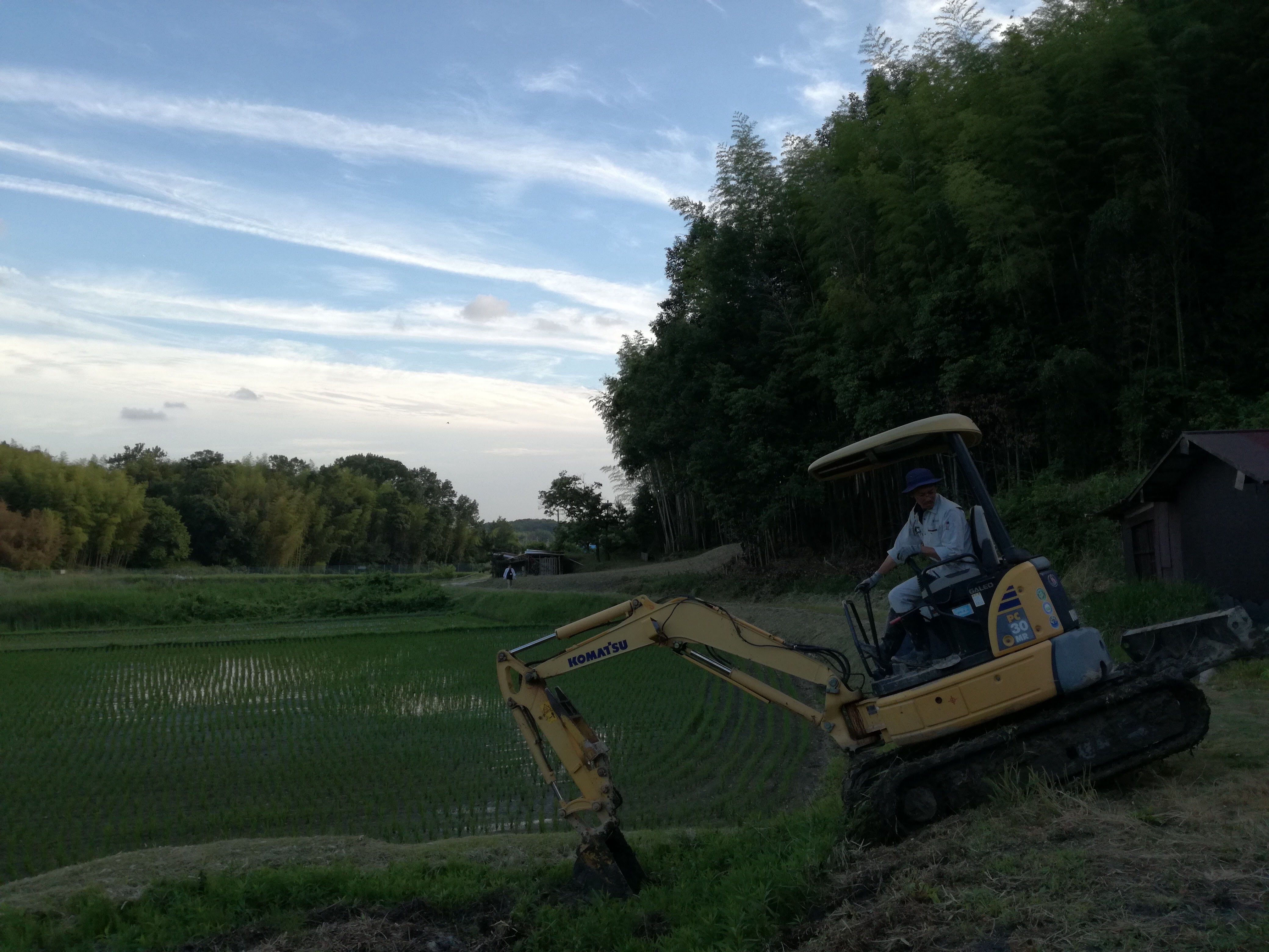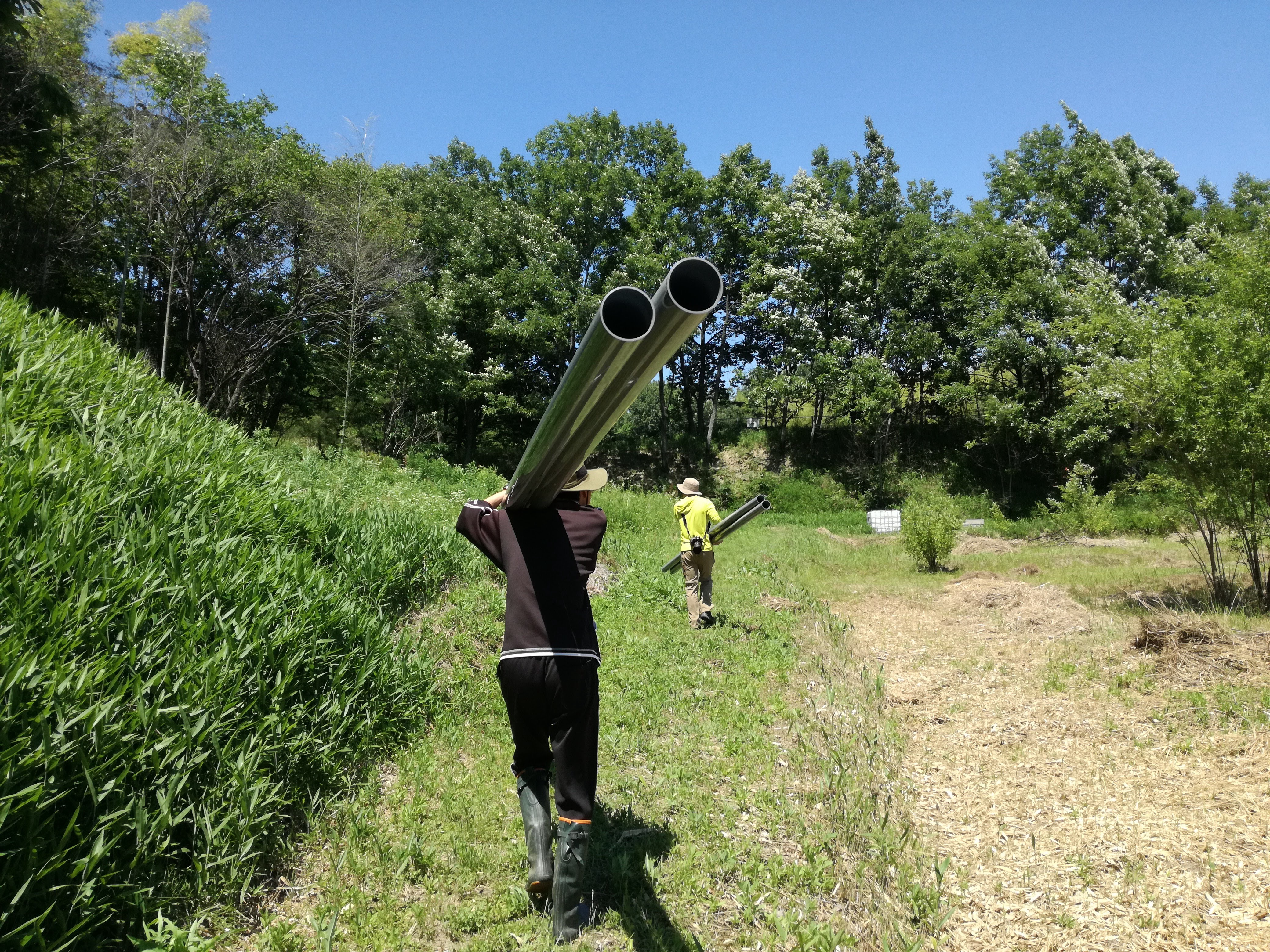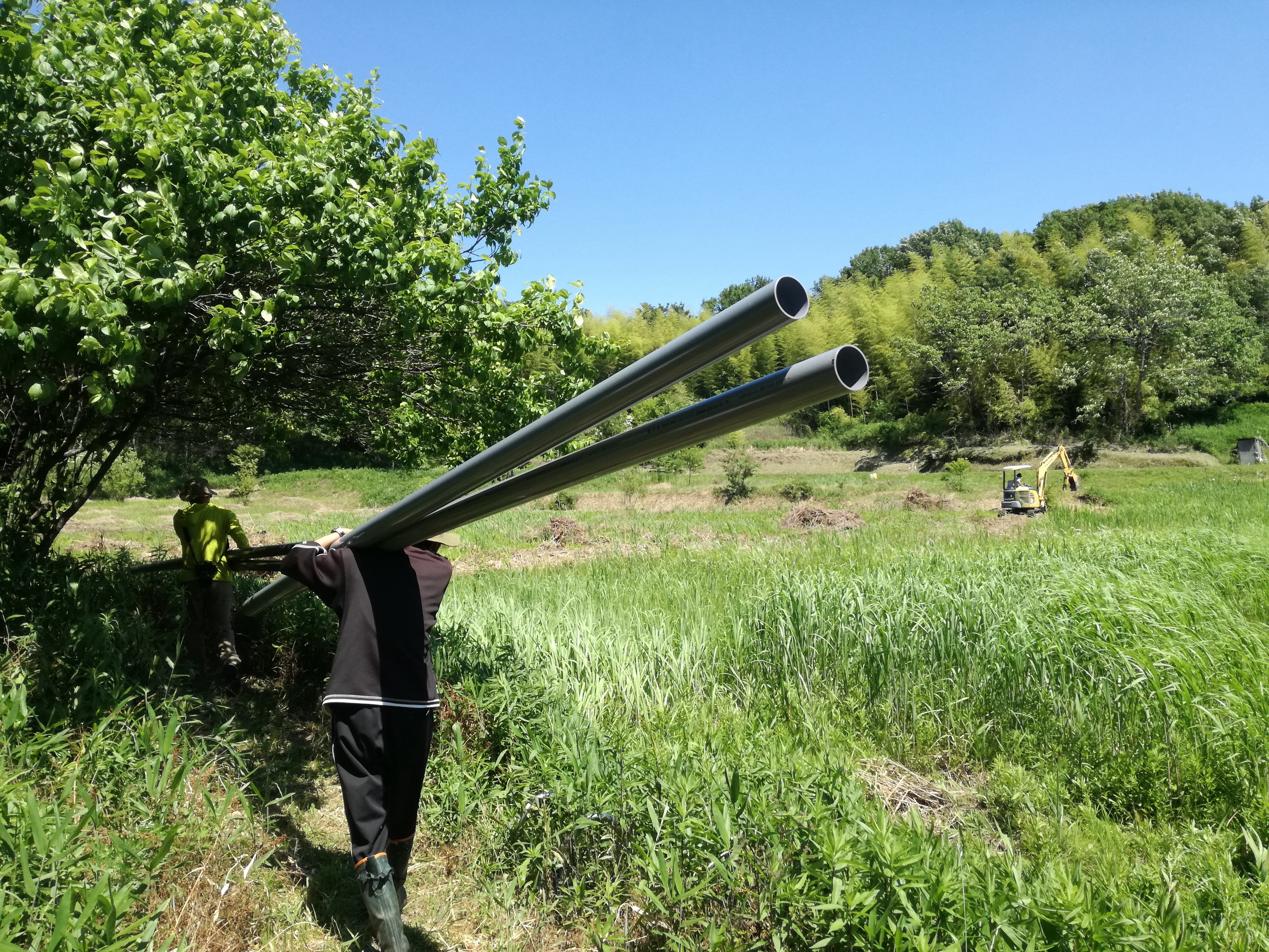 重機が通れる道が無い、沼地化してしまっていて土がぐちゃぐちゃ、急勾配な畦で数々の面が小さな棚田に区切られてる、という悪条件の中、愛長造園さんが神技連発くださいました!!