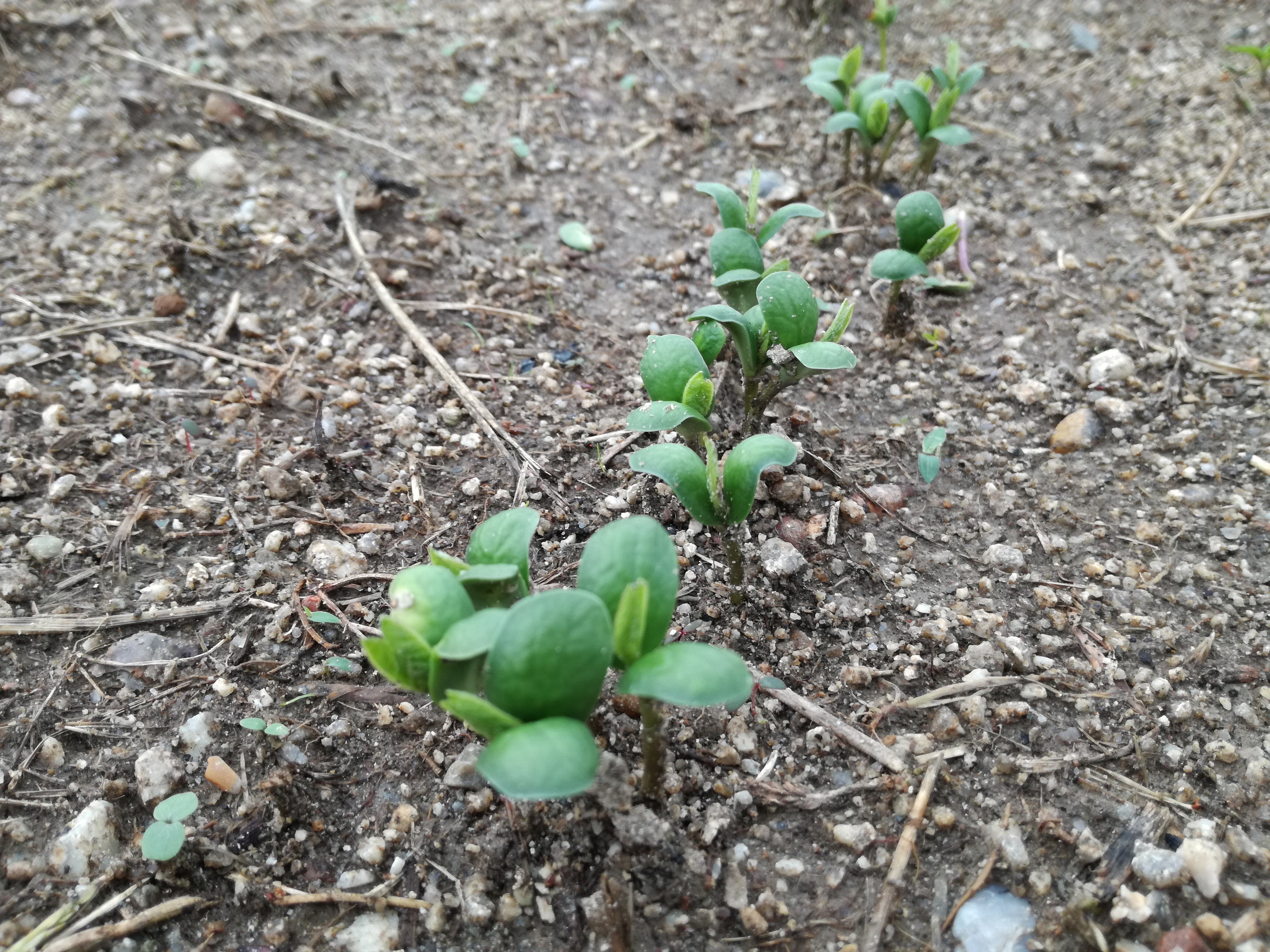 今日観察してたら、出芽した子葉を食べようとして、美味しくなくてやめたんだなっていう形跡がいくつか。子葉が取れちゃってるんだけど、食べてなくて落ちてるから、出芽して地上に出て緑がかってきた子葉は、鳩たちにとっては美味しく無いんだろうな。