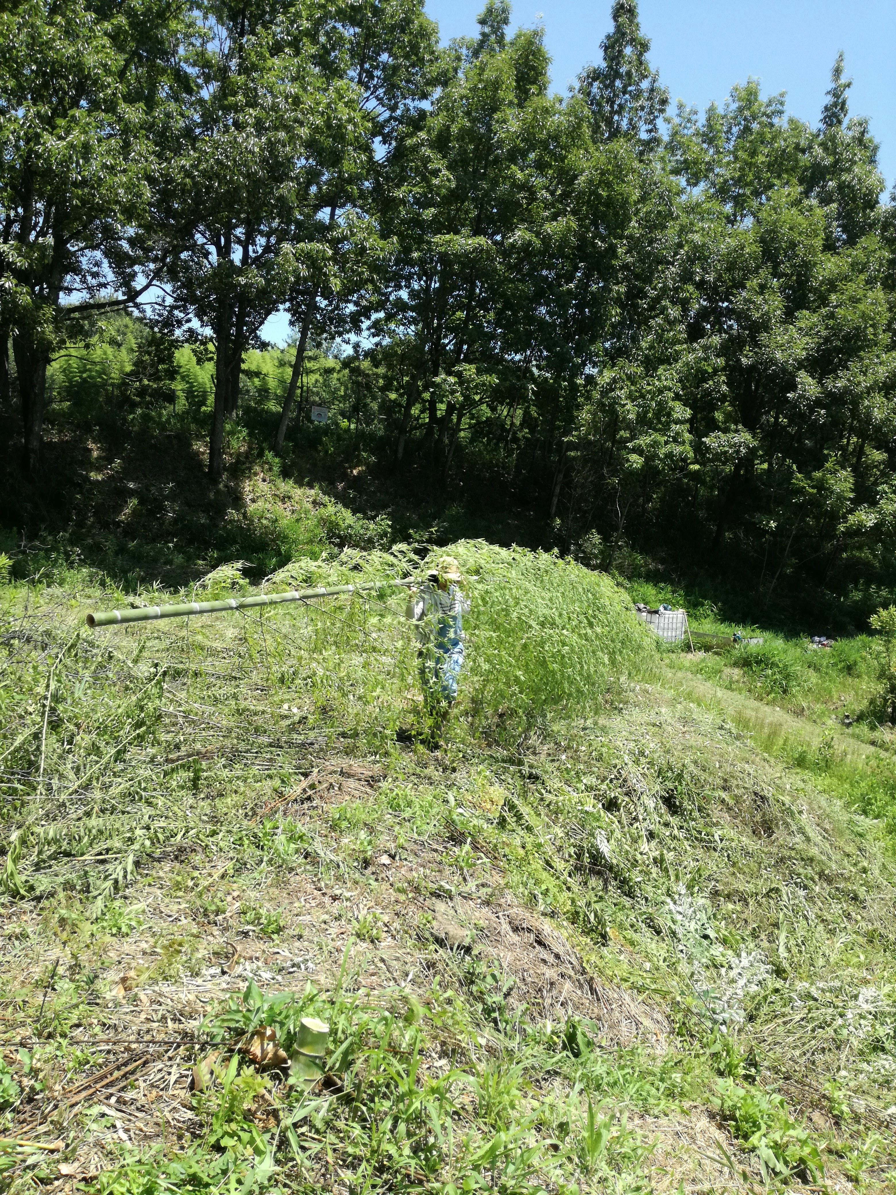 運ぶついでに隠れ蓑術。竹に紛れて、鹿に警戒されないようにするのです。先日、サルナシの手入れをしてたら至近距離で鹿に逆観察されてたので、観察し返そうと。鳴き声がしたのでこれは今日はいるぞと思って。しかし全然隠れてないな。