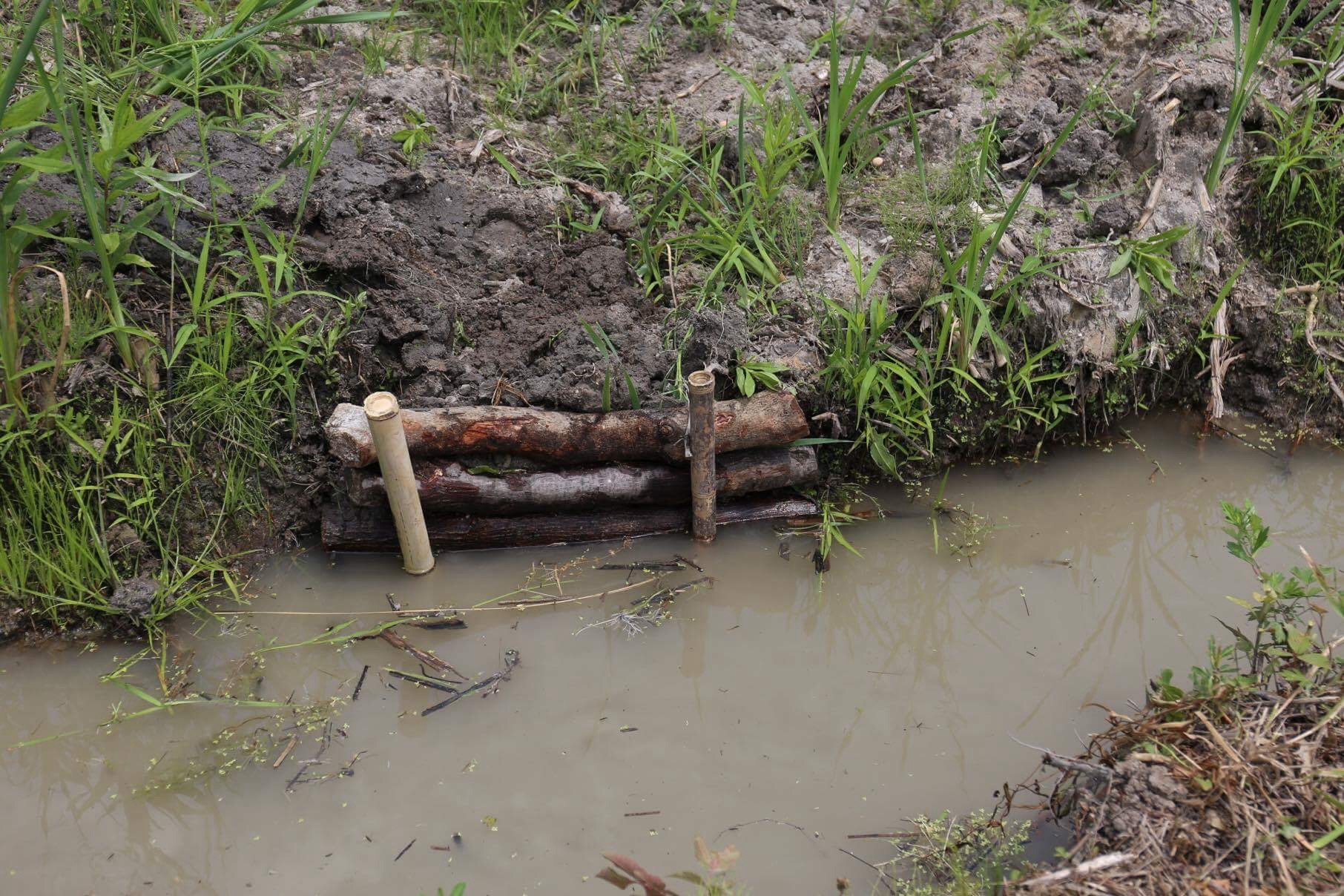 大変だ!無残にも思いっきり土が流されてるー!ここにも竹と丸太で土留めして、もう一度しっかりと埋め直しをします。