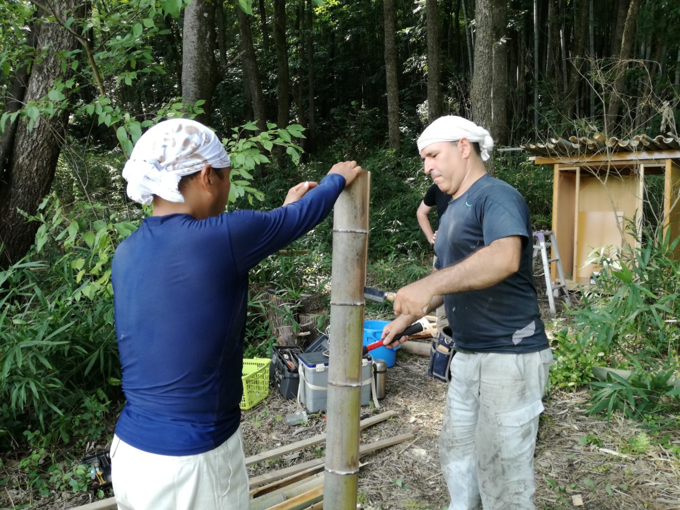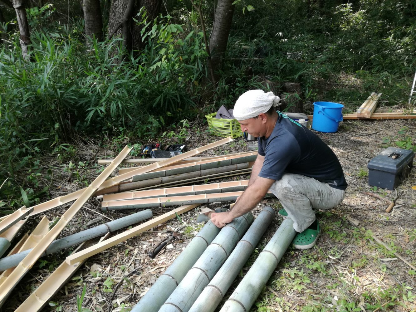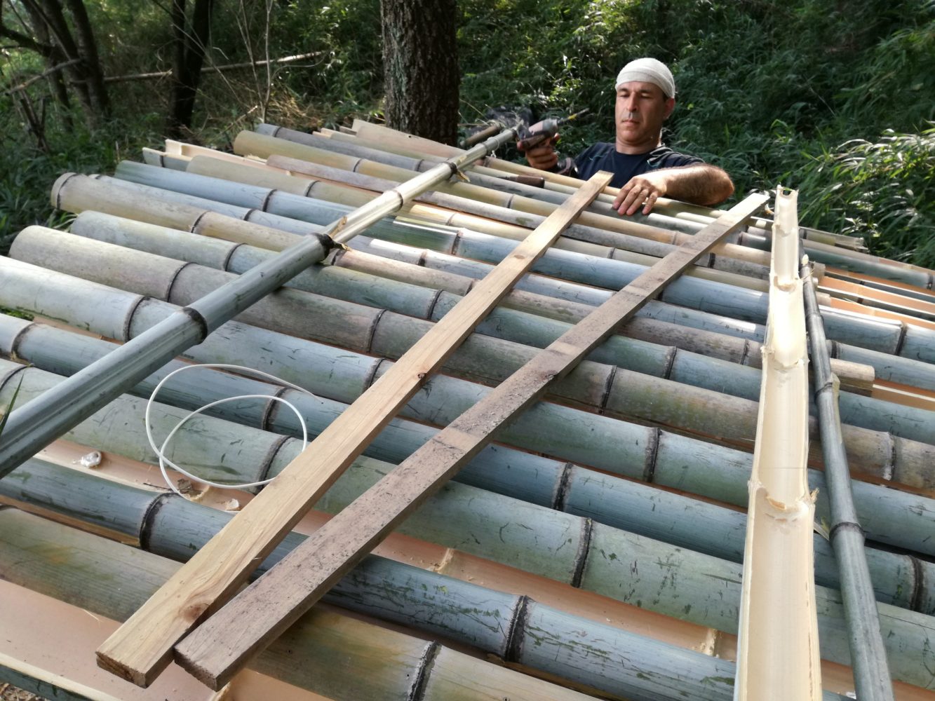 竹の屋根も、トタン買ってくるのはやっぱりなんだか味気無いからと、その場で考えて工夫なさっていて。