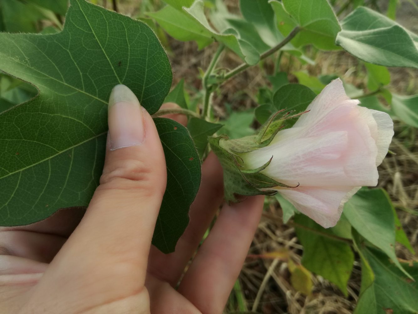 綿の花。萎んだばかりで、まだ薄いぴんく。