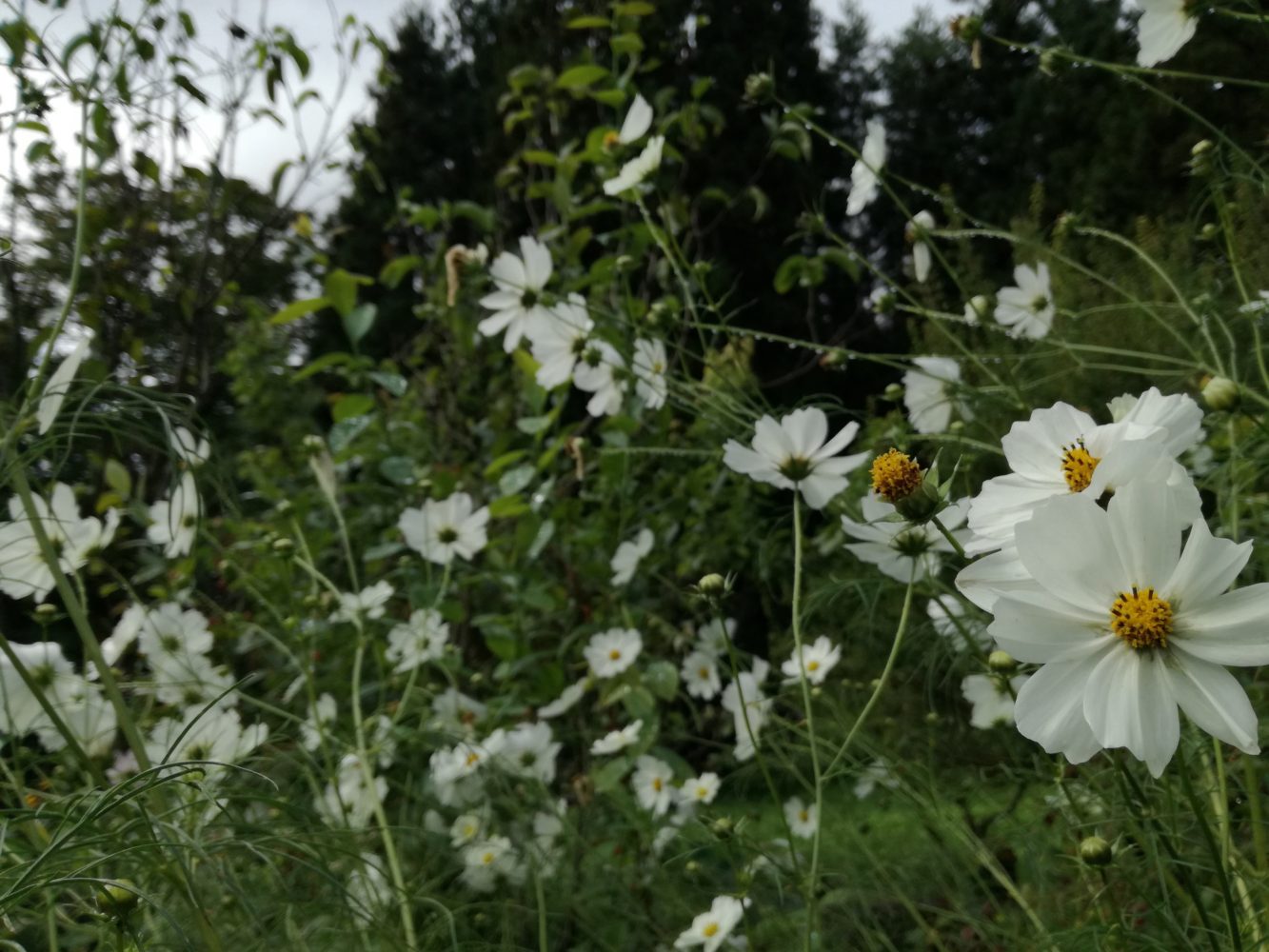 真っ白なコスモス。白いお花ばかりのコスモスって、あまり見たことないかも。雨の雫を残していて、美しいなぁ。