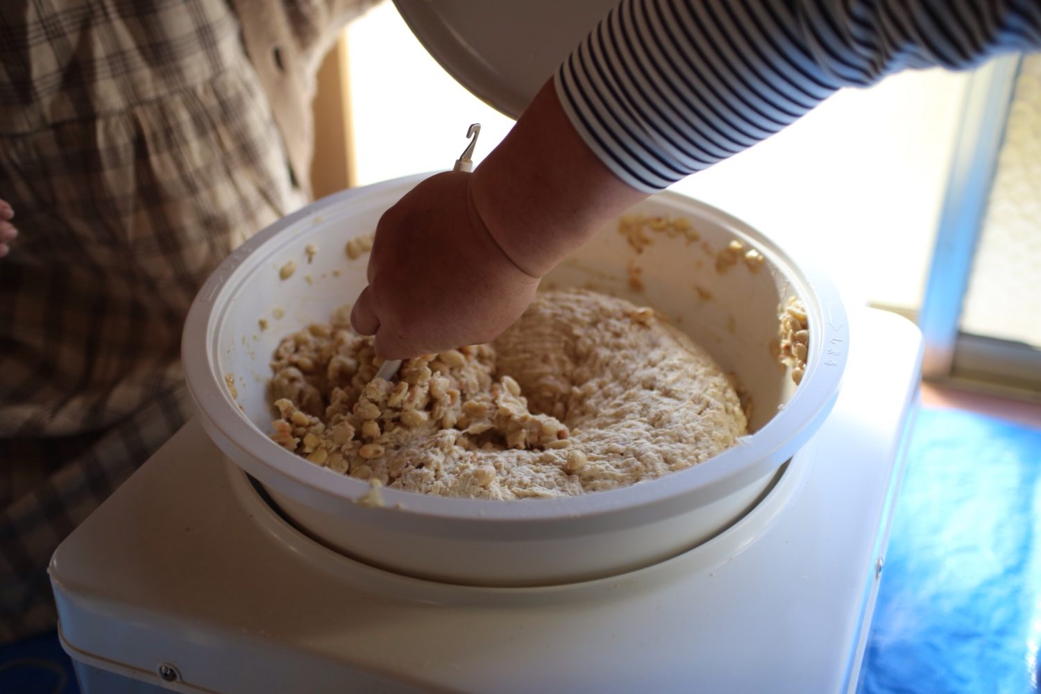 日本酒のような香りと、納豆のような香りもしながら混ざり合い、そのペースト状の豆を一つの桶に入れゆっくりと菌の力で醸します。どうやって開発されたのか・・・。