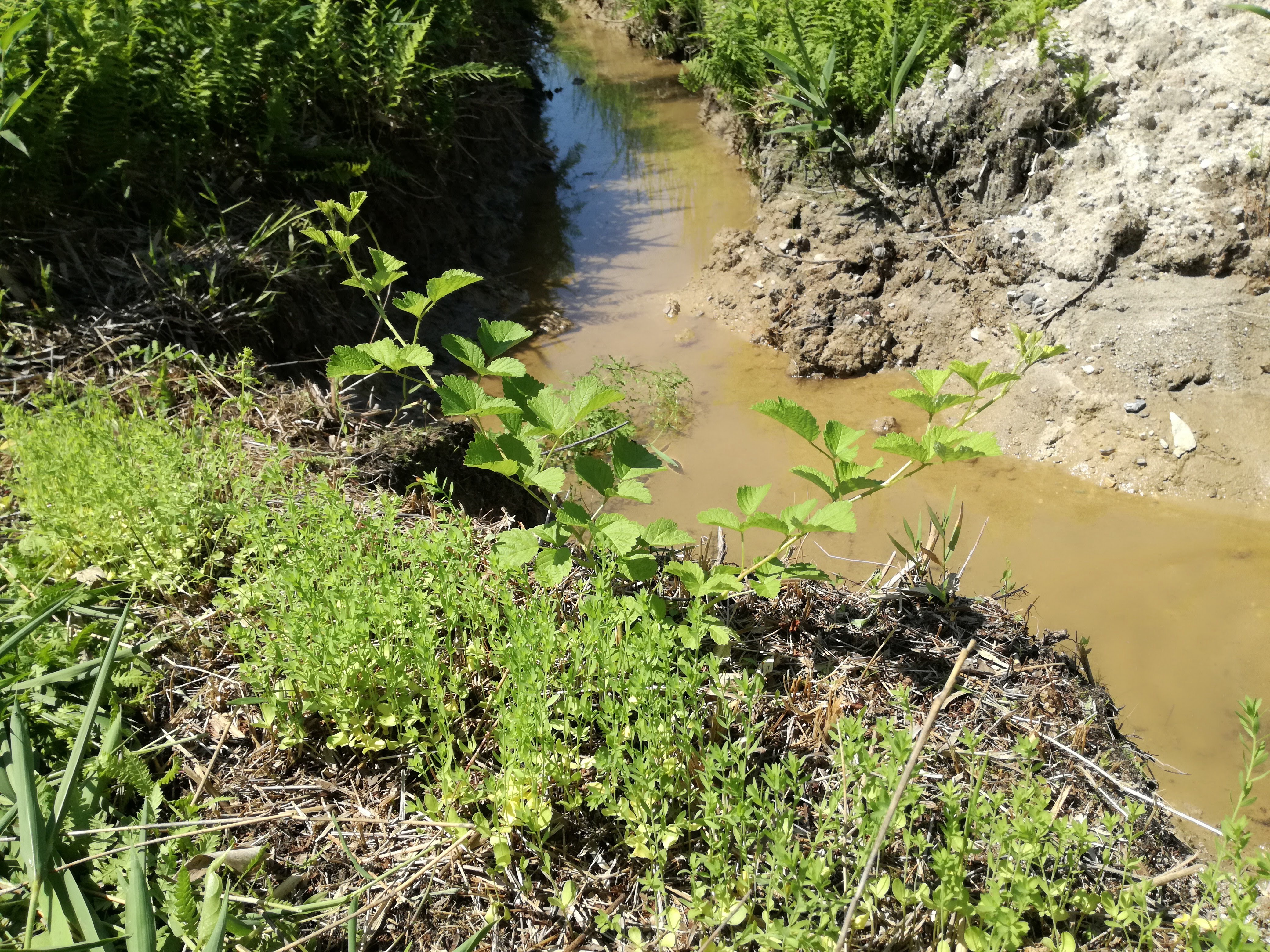 6月5日に溝を切り始め、その溝から湧水が出ていて翌日の6日には溝に水が流れ始めました。流れの優しい小川みたいに。その時、すぐにトンボが飛んできて溝に卵を産みつけ始め、カエルが泳ぎにきました。食物連鎖のスタートを見た気がして、なんだか感動しました。